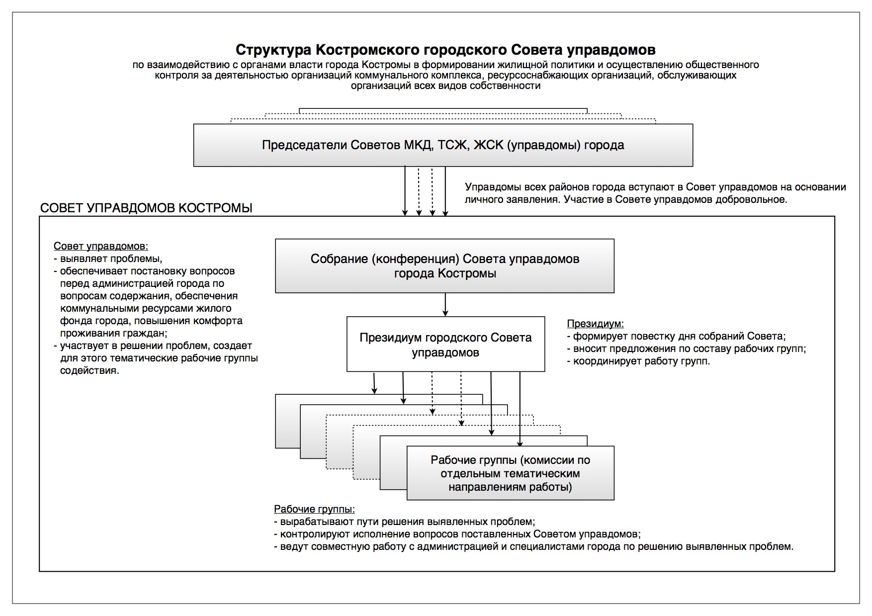 Прием в члены Совета председателей советов многоквартирных домов, председателей правления ТСЖ и ЖСК производится на основании простого письменного заявления в адрес Костромского городского совета управдомов.